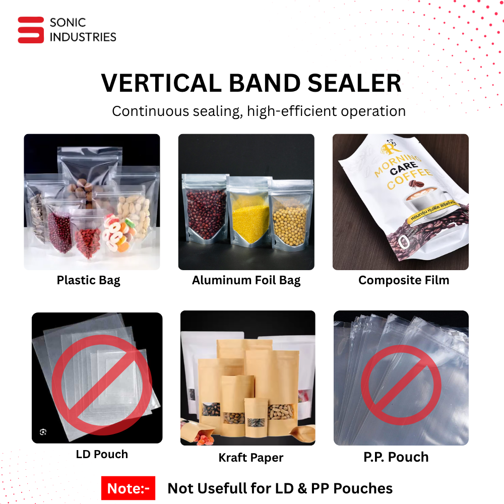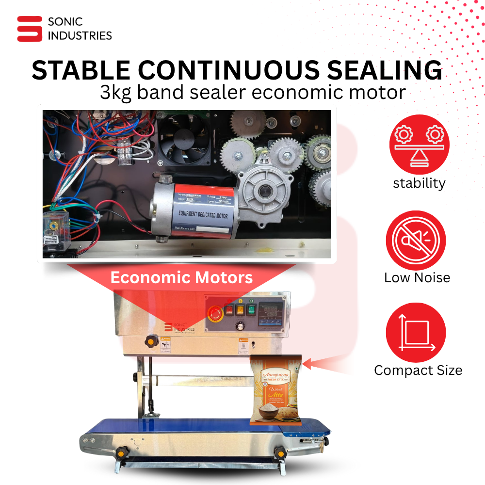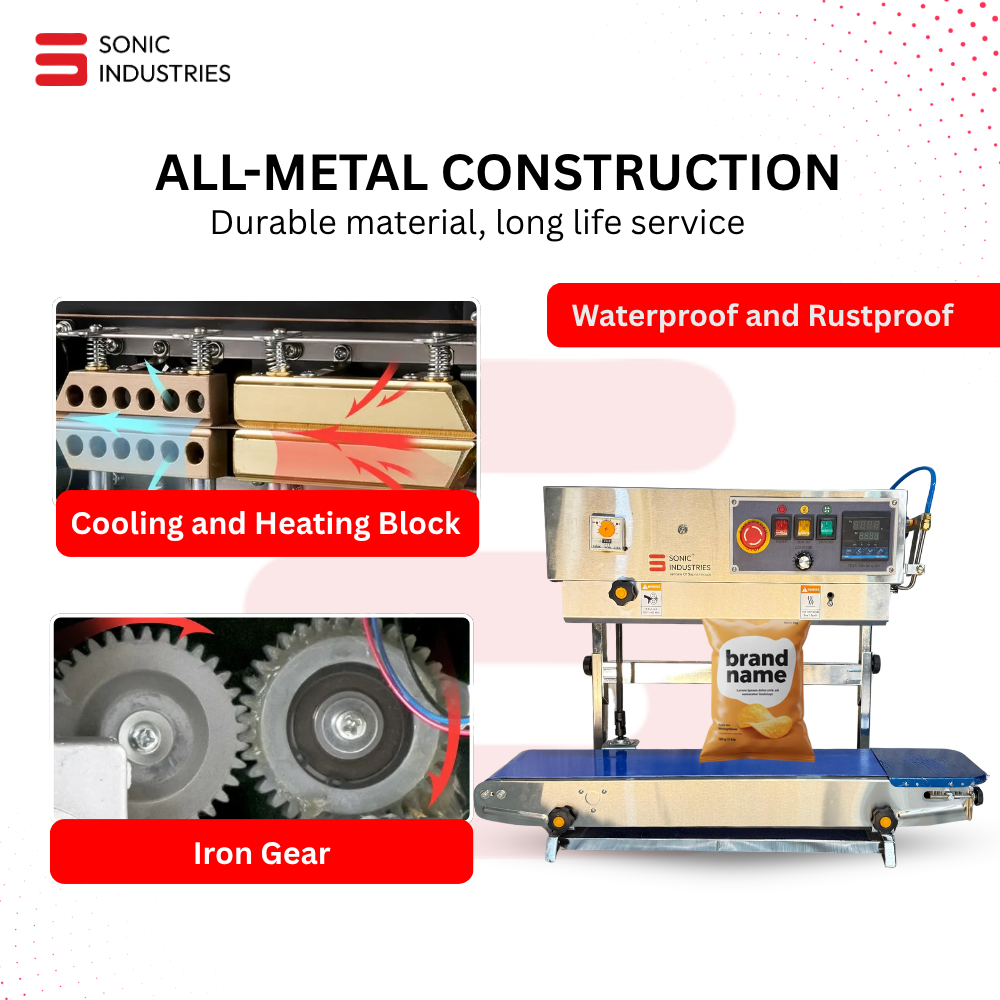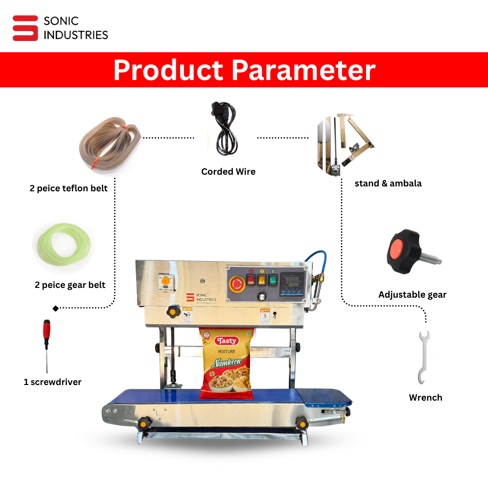 The Sonic Industries FR-900 Vertical Continuous Band Sealer (3kg, Stainless Steel) is a compact yet industrial-grade solution designed to simplify and optimize your sealing process.