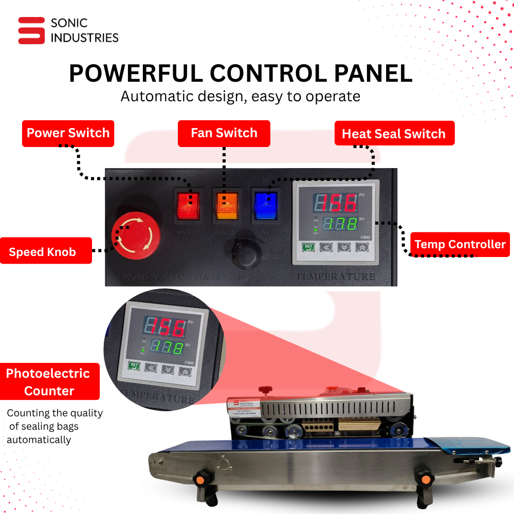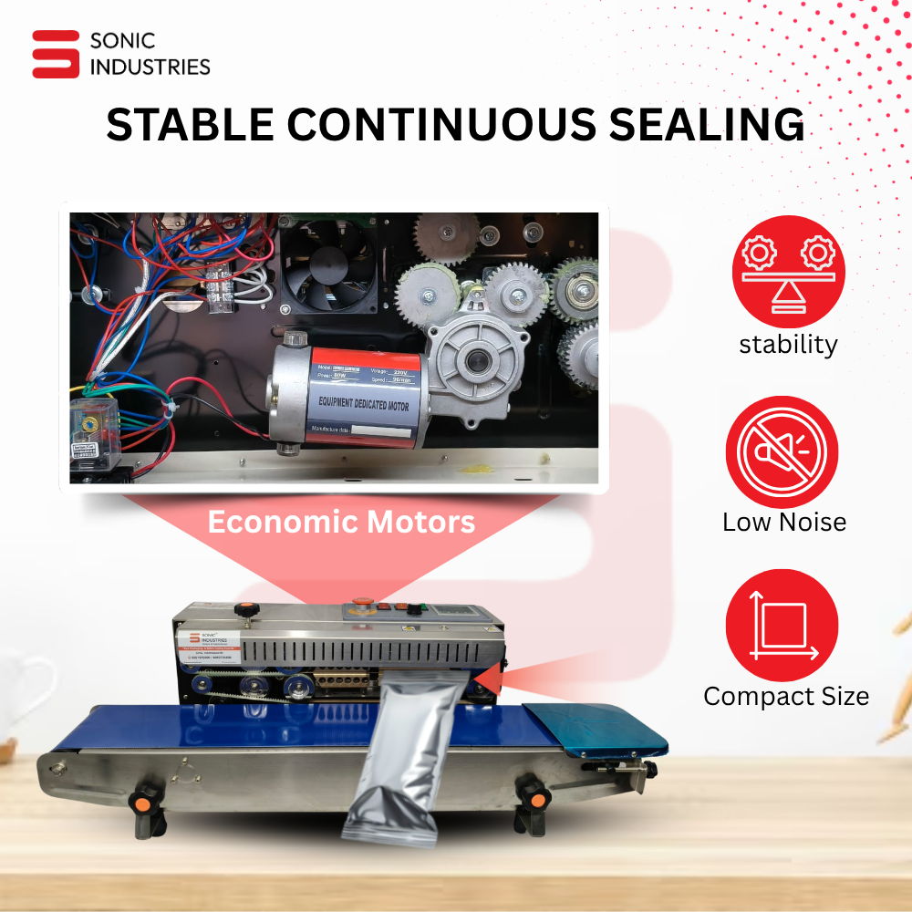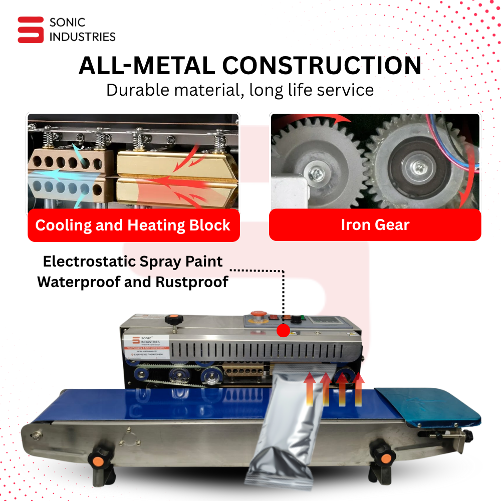 The Sonic Industries FR900 SS Continuous Band Sealer is engineered for small to medium-scale manufacturers seeking consistent, high-quality sealing performance at an affordable cost. Built with a sturdy stainless-steel body, this machine provides the perfect balance between strength, precision, and hygiene.
