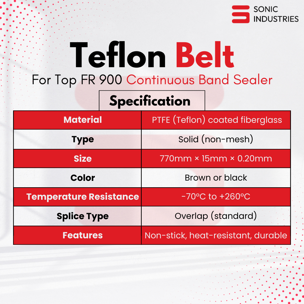 The Sonic Industries Teflon Belt Top Model is engineered for demanding industrial packaging lines that run 24/7, require consistent sealing quality, and can’t afford machine stoppages.