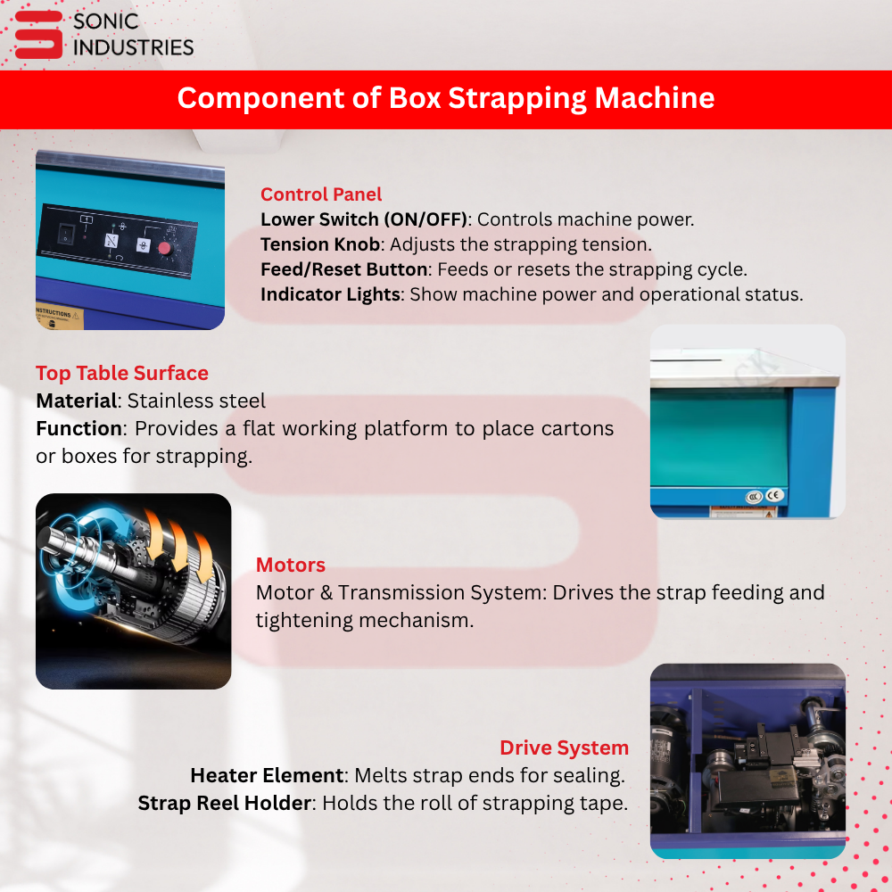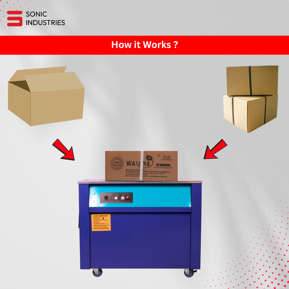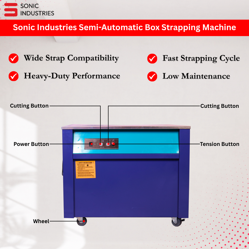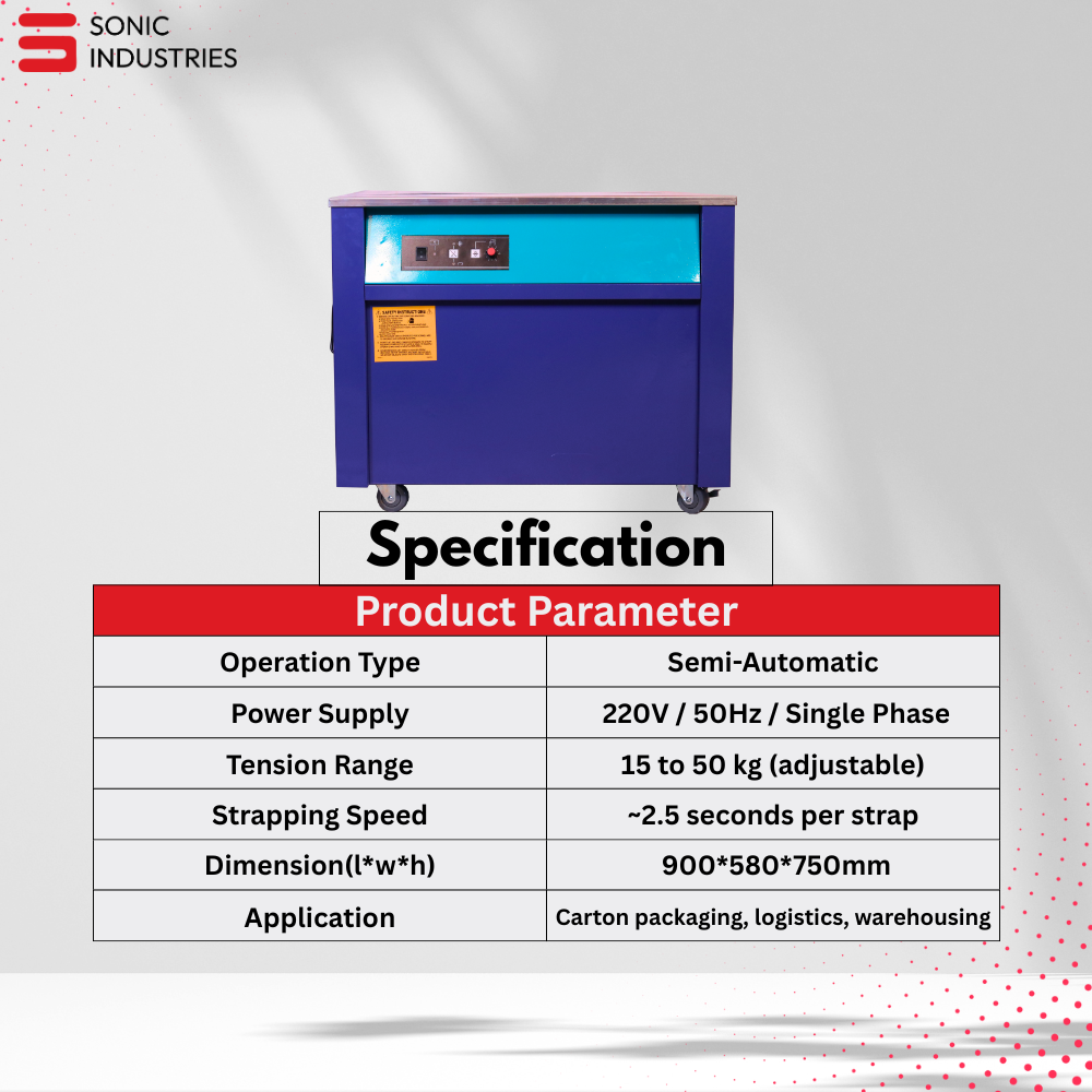 The Sonic Industries KH-90 Semi-Automatic Box Strapping Machine is a heavy-duty carton strapper designed to streamline the packaging process for businesses of all sizes. Built with industrial-grade components and user-friendly controls, this machine delivers precision strapping with minimal manual effort.