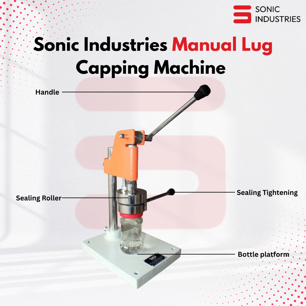 The Sonic Industries Manual Lug Capping Machine is a hand-operated device designed to securely seal glass bottles and jars with lug caps. Lug caps, which feature multiple thread-like indentations, are widely used in food, beverage, and pharmaceutical packaging because of their airtight seal and tamper-proof design.