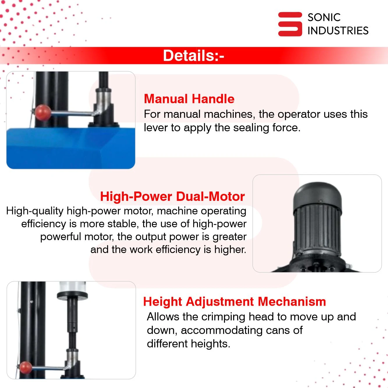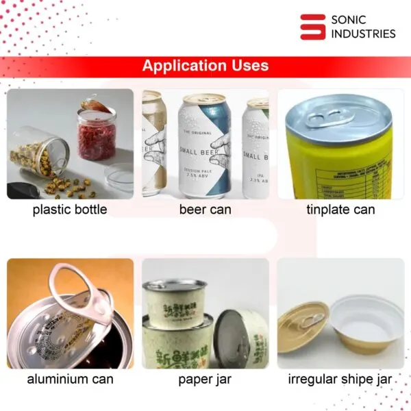 It can seal tins from 100 gm to 5 liters, depending on model configuration.