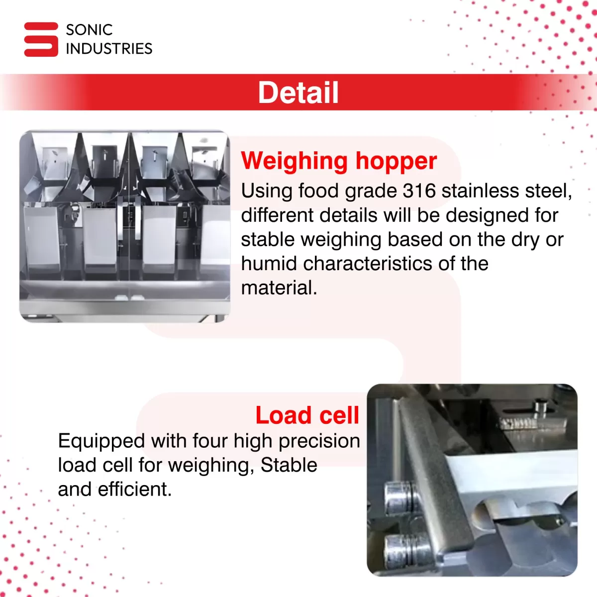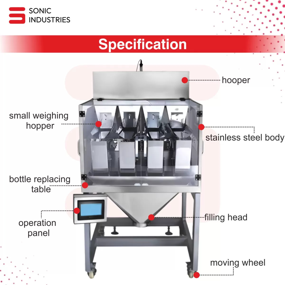 The Sonic Industries 4 Head Granule Filling Machine is engineered with state-of-the-art technology to streamline granule packaging processes. It combines precision weighing, fast filling, and user-friendly controls into a compact, robust machine.