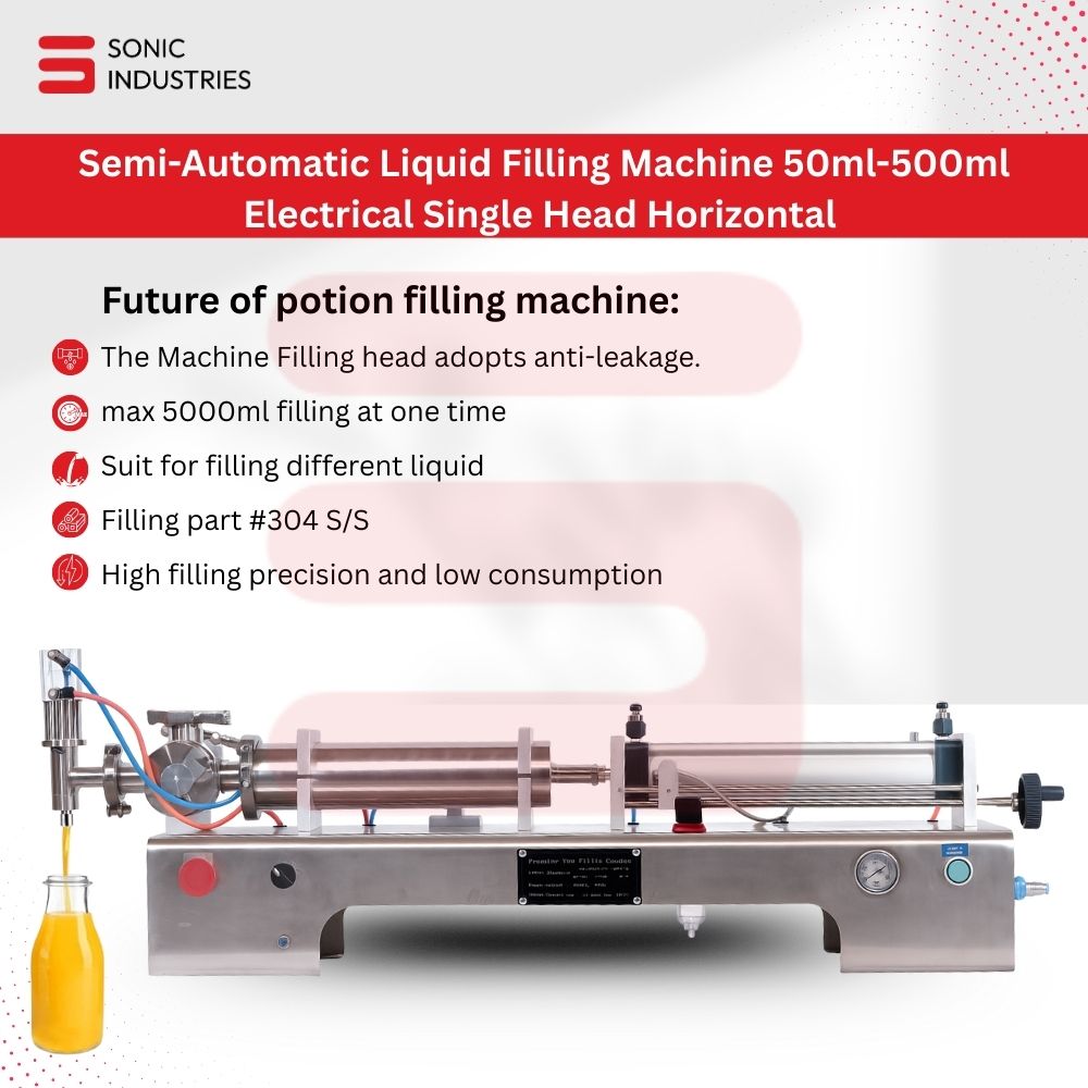 Filling liquid products accurately and efficiently is one of the biggest challenges for industries involved in food, beverages, pharmaceuticals, cosmetics, and chemicals. Manual filling not only consumes more time but also compromises accuracy and hygiene, leading to product wastage and inconsistent packaging. To solve these challenges, Sonic Industries presents the 50 to 500ML Pneumatic Liquid Filling Machine – a high-performance, semi-automatic solution built with advanced pneumatic technology for precise and reliable filling.
