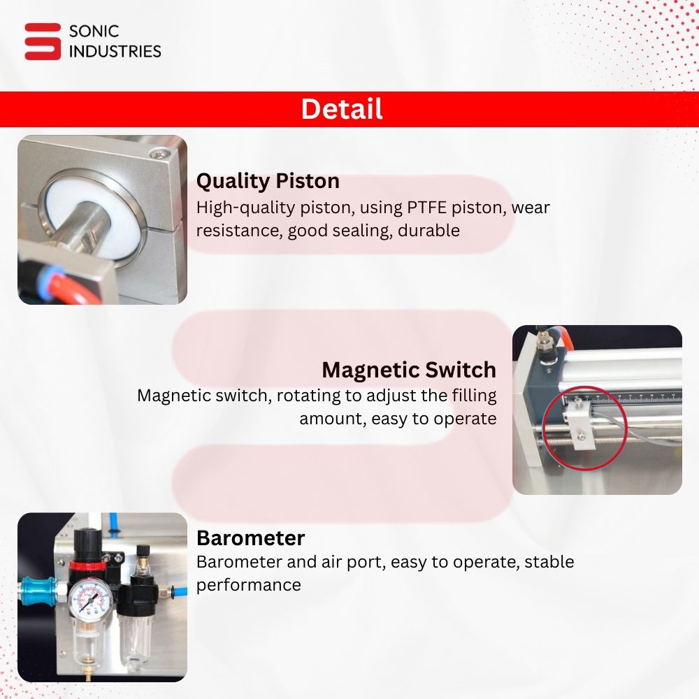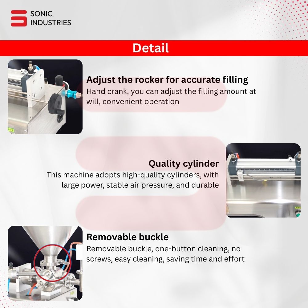 The Sonic Industries 50 to 500ML Pneumatic Liquid Filling Machine is not just another filler; it is a precision-engineered semi-automatic system built to provide efficiency, versatility, and durability. It is specifically designed for industries where accuracy, hygiene, and consistency are critical. Below is a deep dive into everything that makes this machine one of the most sought-after solutions in liquid packaging.
