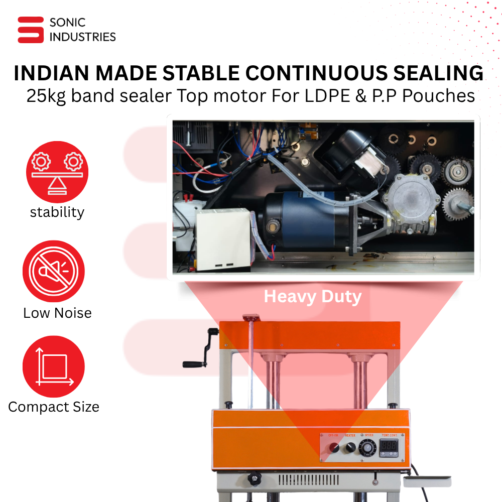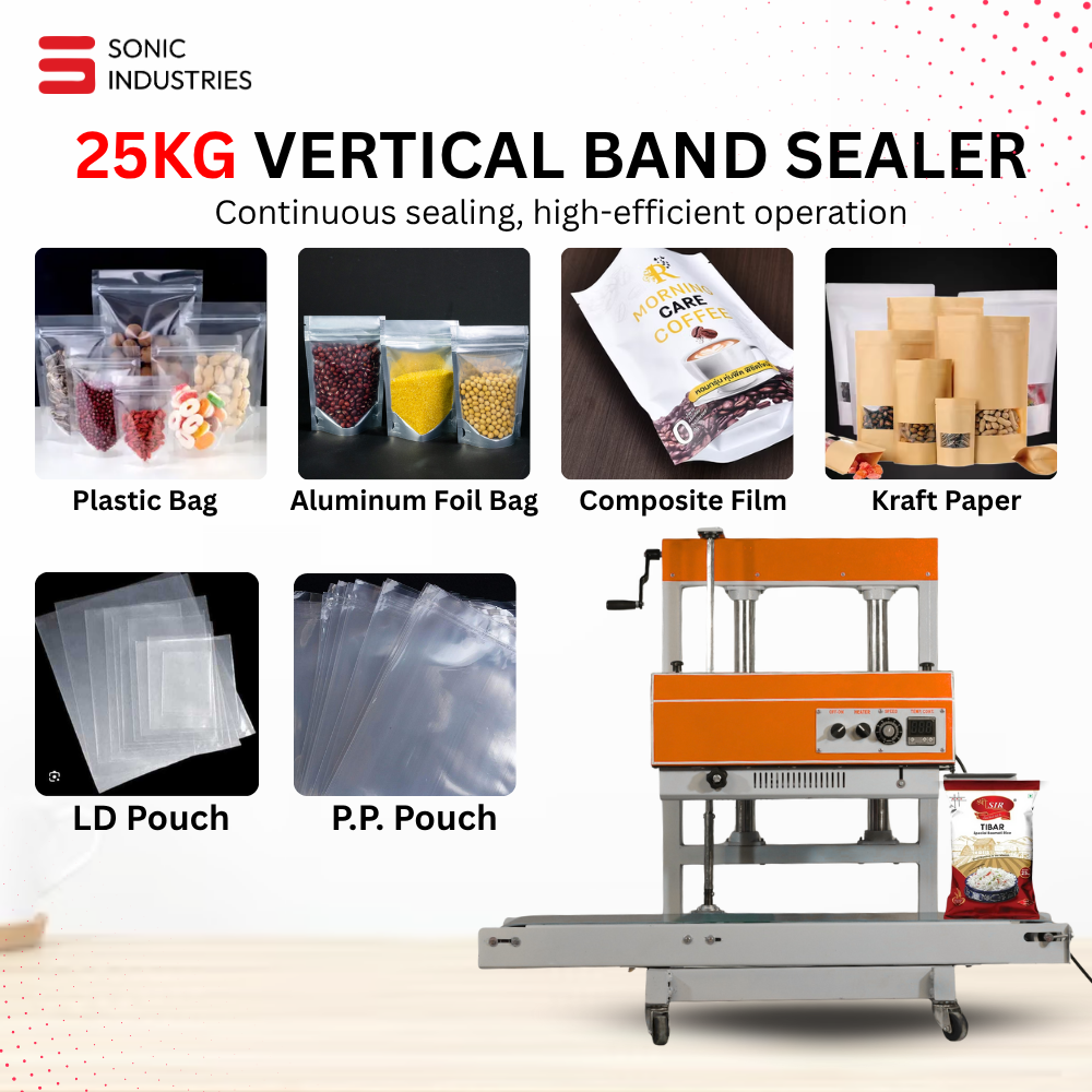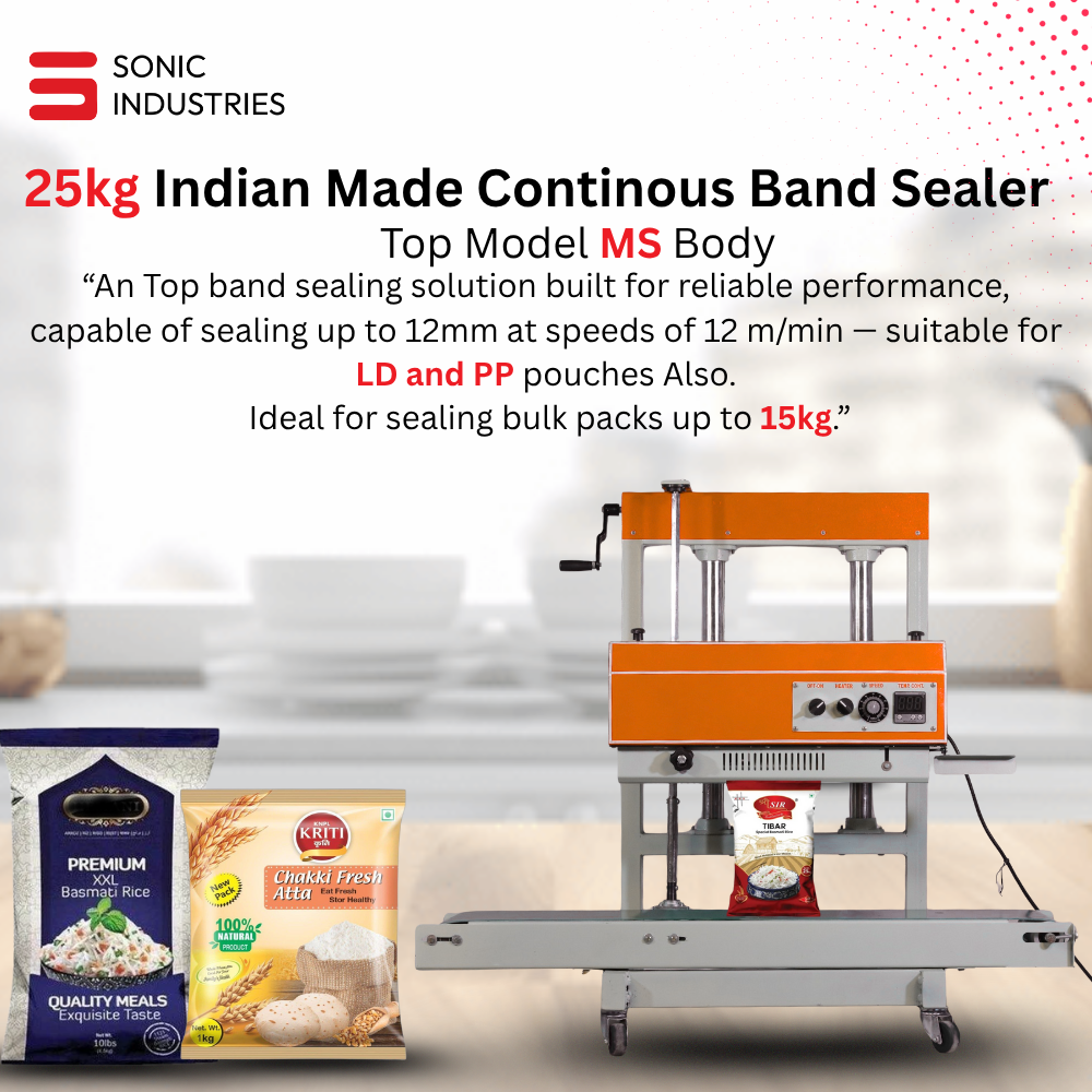 In the world of industrial packaging, efficiency, reliability, and sealing precision are non-negotiable. The Sonic Industries Continuous Band Sealing Machine 25KG – Indian Make Heavy-Duty Sealer is designed to meet the growing needs of large-scale manufacturers and packers who handle bulky or high-volume packaging operations.