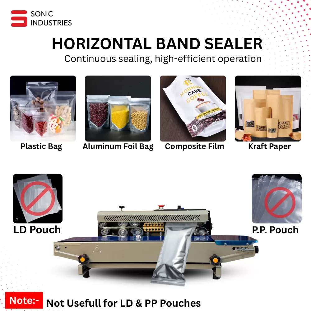 In modern packaging industries, consistency and sealing quality play a crucial role in product preservation and presentation. The Sonic Industries MS Body Band Sealer FR-900 Eco Model is a high-performance continuous sealing machine designed for reliability, strength, and affordability. With a robust Mild Steel (MS) body, this model is ideal for industries looking for an efficient and long-lasting packaging solution for laminated, BOPP, aluminum foil, and composite film pouches.