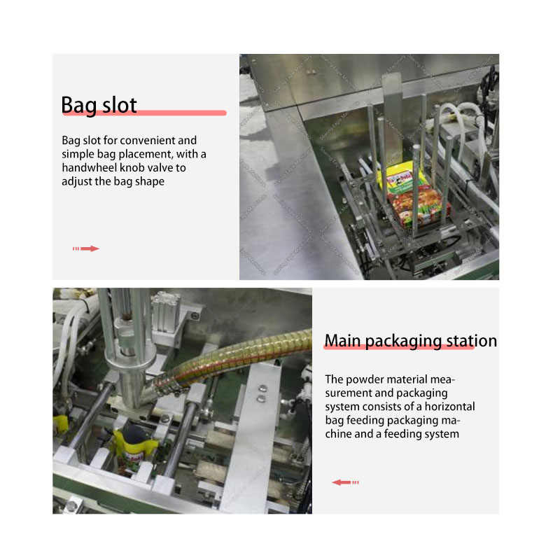 The volumetric piston filler accurately dispenses the set quantity (50g–500g) into each pouch.