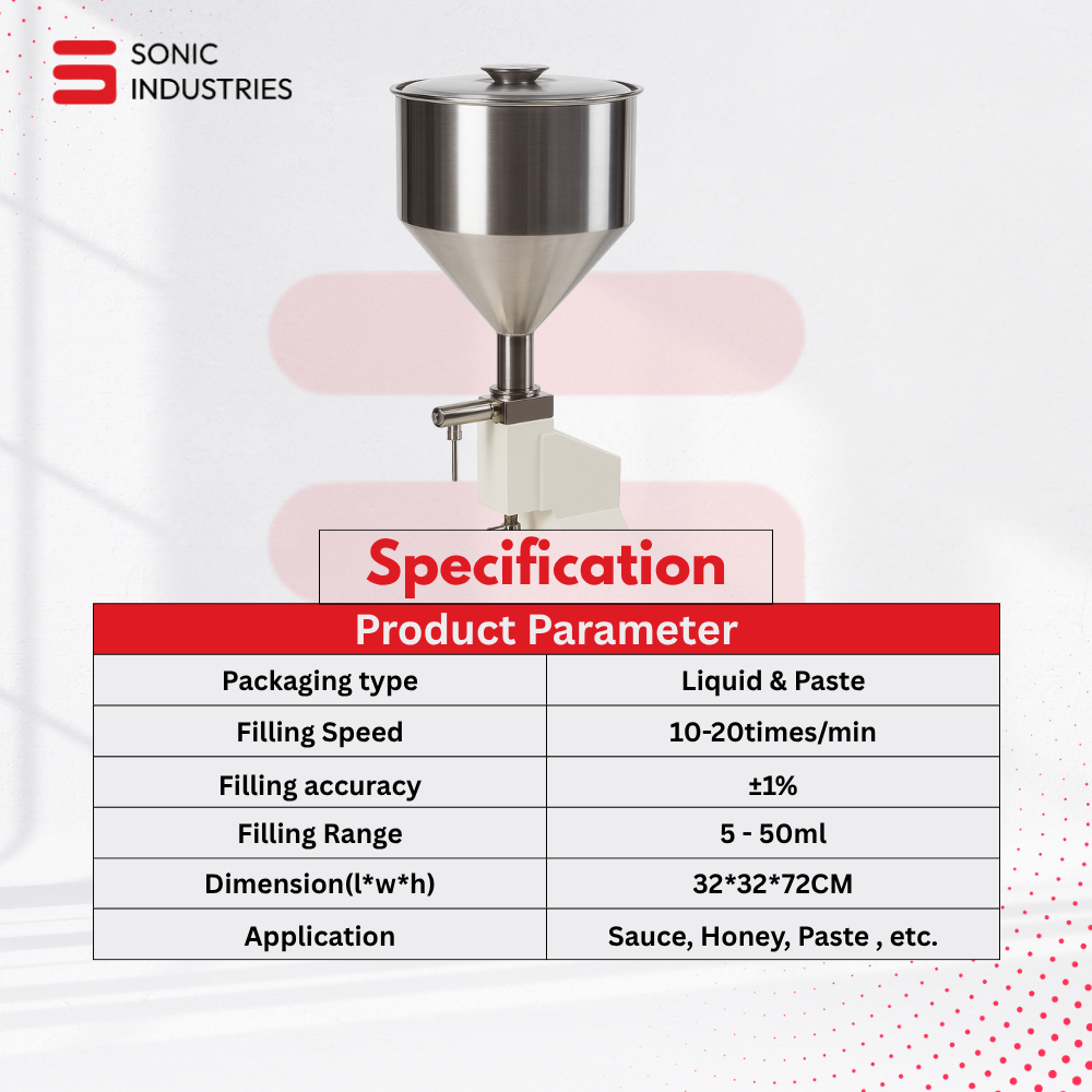 To address these challenges, Sonic Industries introduces the Pneumatic Paste Filling Machine 5–50ML– Semi-Automatic Viscous Liquid Filler. This machine is specially designed to handle small-volume precision filling of viscous products, making it the perfect solution for industries that demand high accuracy, hygiene, and reliability. Built with advanced pneumatic technology, it reduces manual workload while increasing efficiency, helping manufacturers streamline their production line without compromising on product quality.