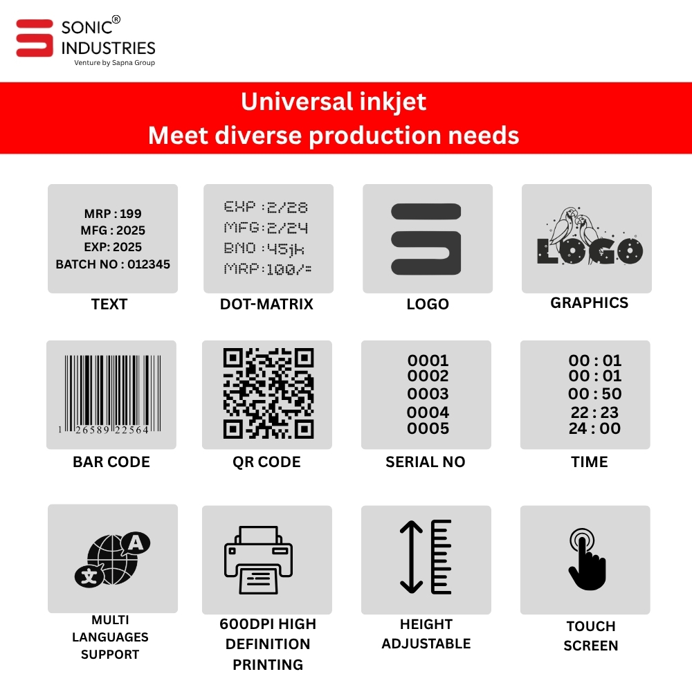 • Supported Formats: Text, QR Codes, Barcodes (1D/2D), Logos, Serial Numbers, Date & Time, Shift Codes, Batch/MRP Printing