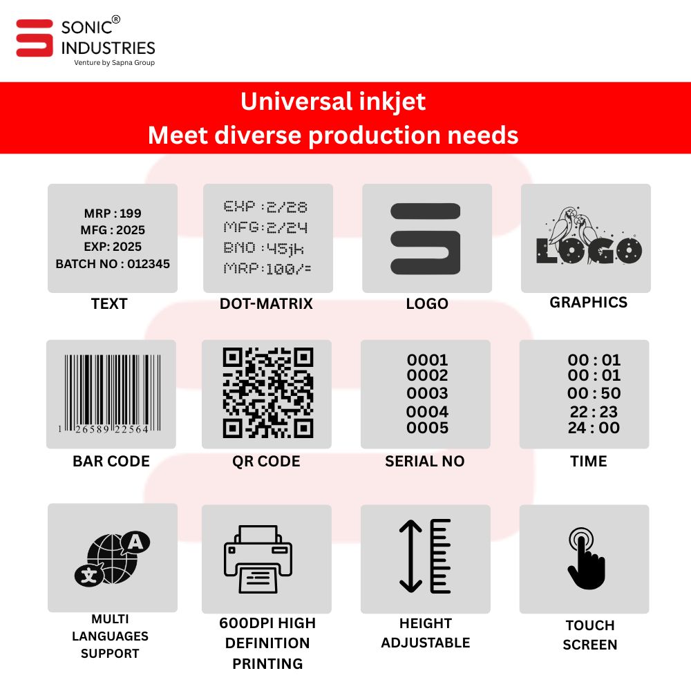 The Sonic Industries Handheld Thermal Inkjet Printer is highly versatile and finds applications in multiple industries: