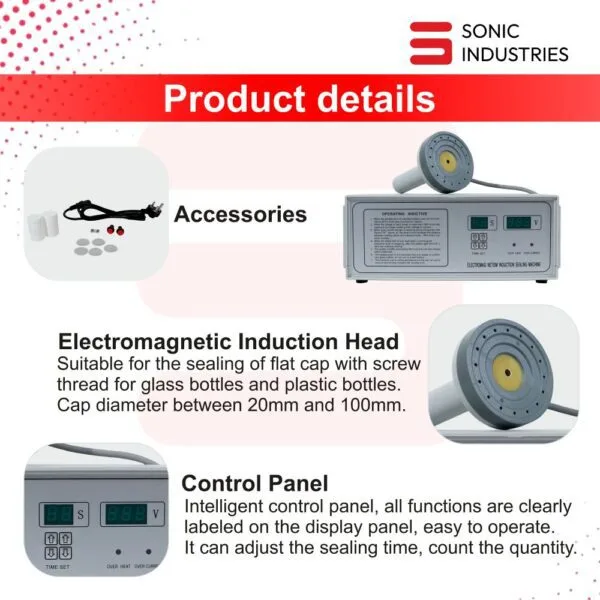Ensure maximum sealing reliability for large-diameter caps with the Sonic Industries 500C Heavy-Duty Induction Sealing Machine. Engineered to seal caps ranging from 60mm to 130mm, this robust machine is purpose-built for industrial production environments where speed, consistency, and durability are essential.