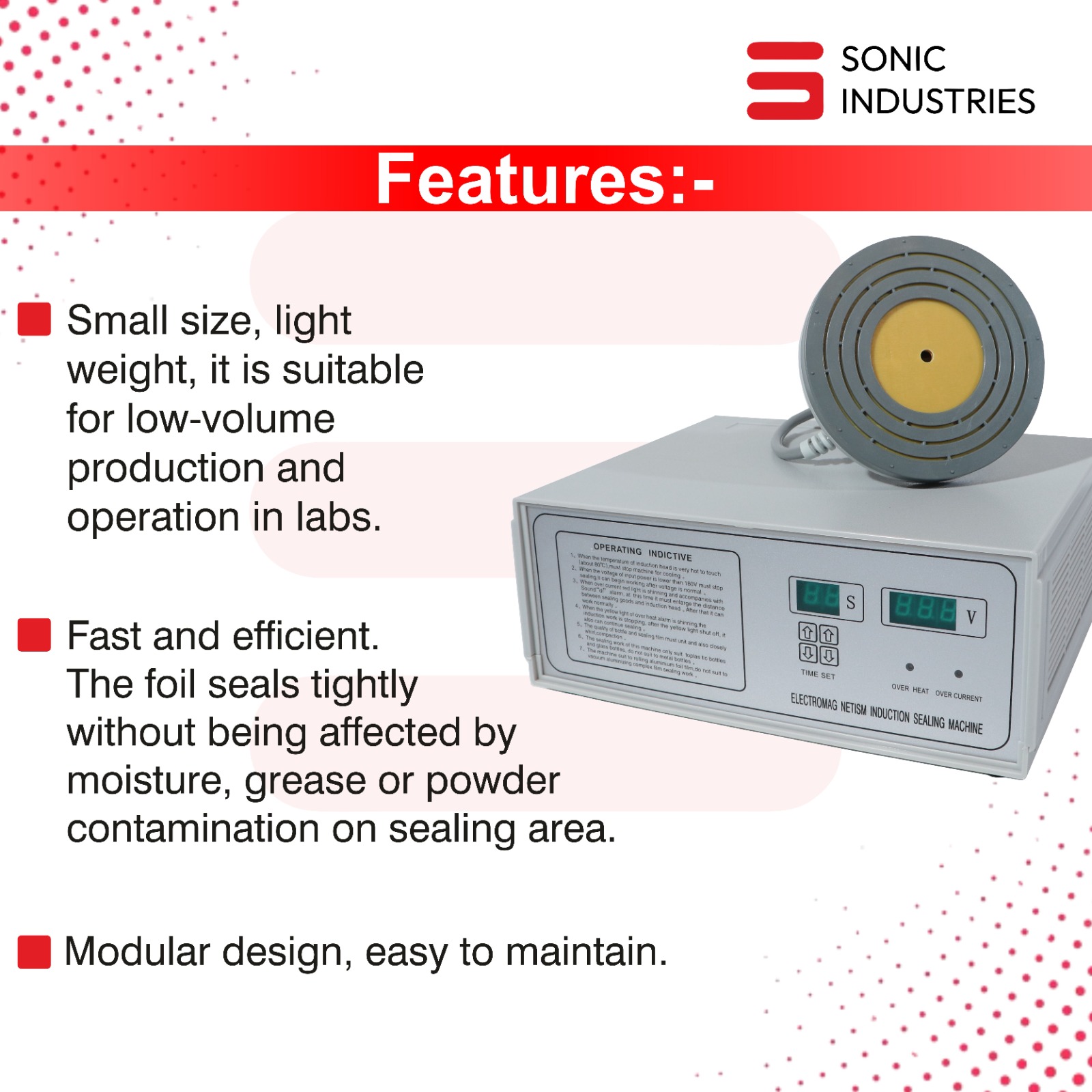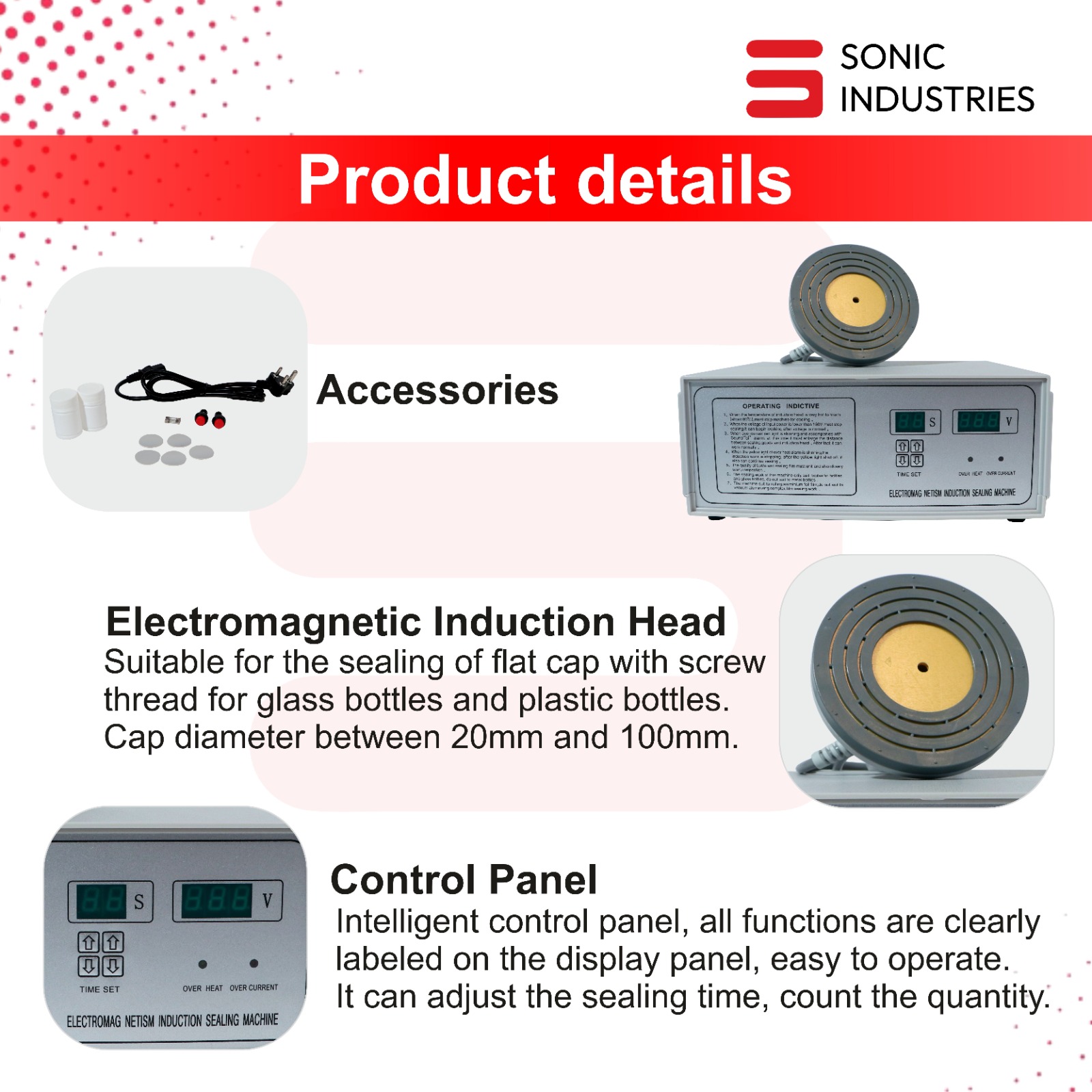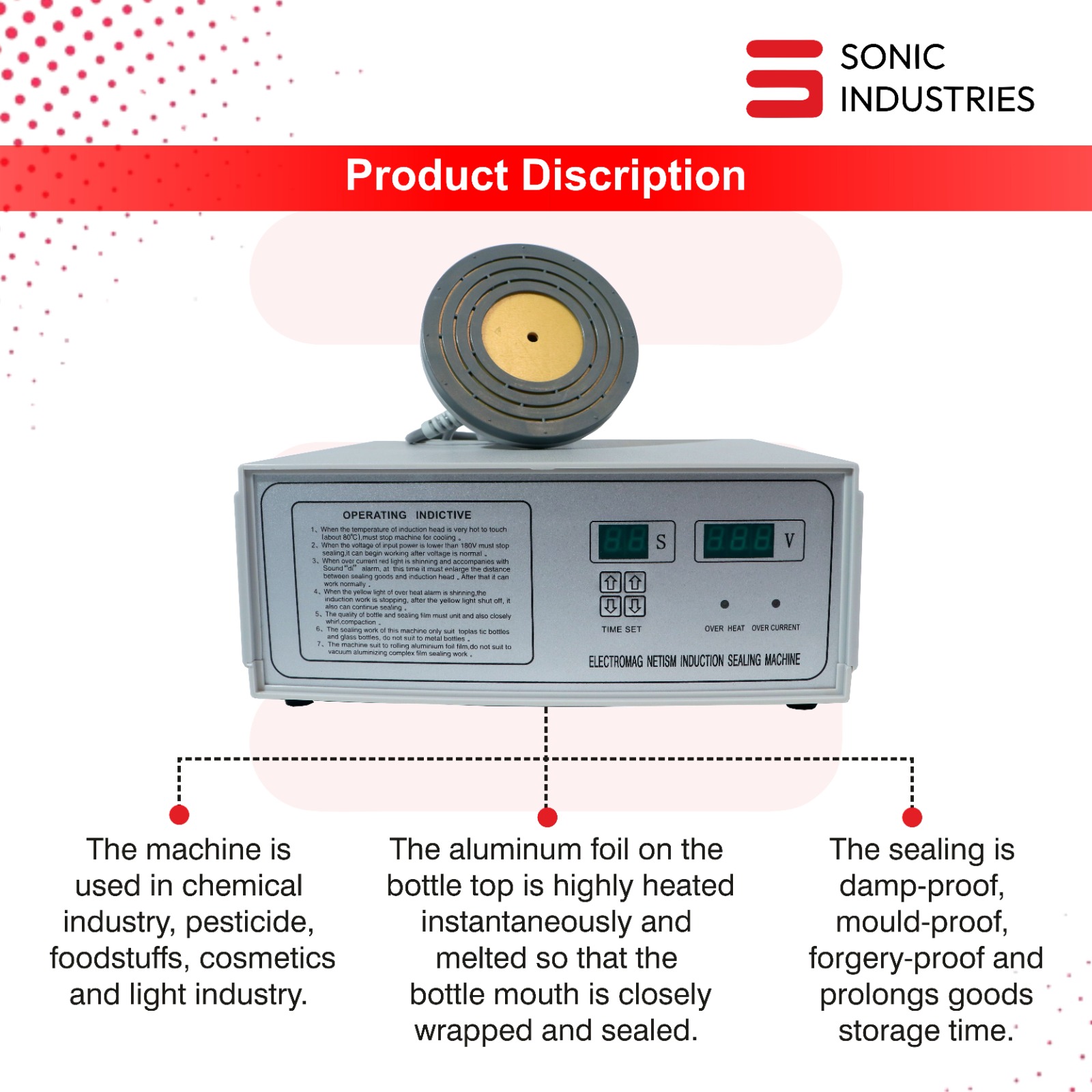The Sonic Industries 500C Heavy Duty Induction Sealing Machine is more than just a cap sealer—it’s a productivity booster for your packaging line. Experience the next level of sealing performance with this robust machine designed for heavy usage and superior results.