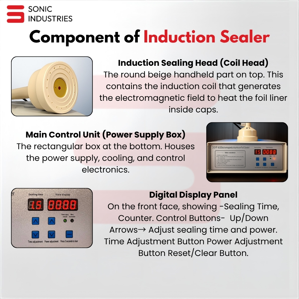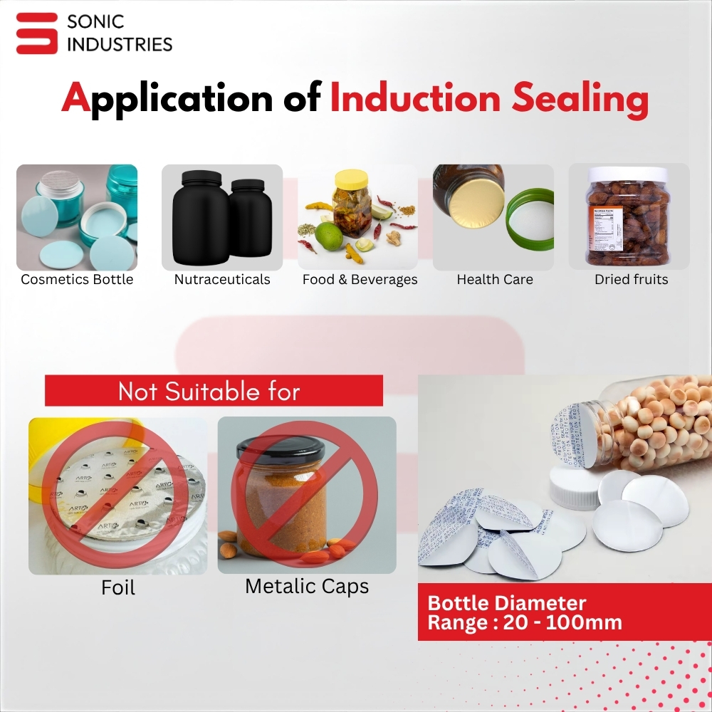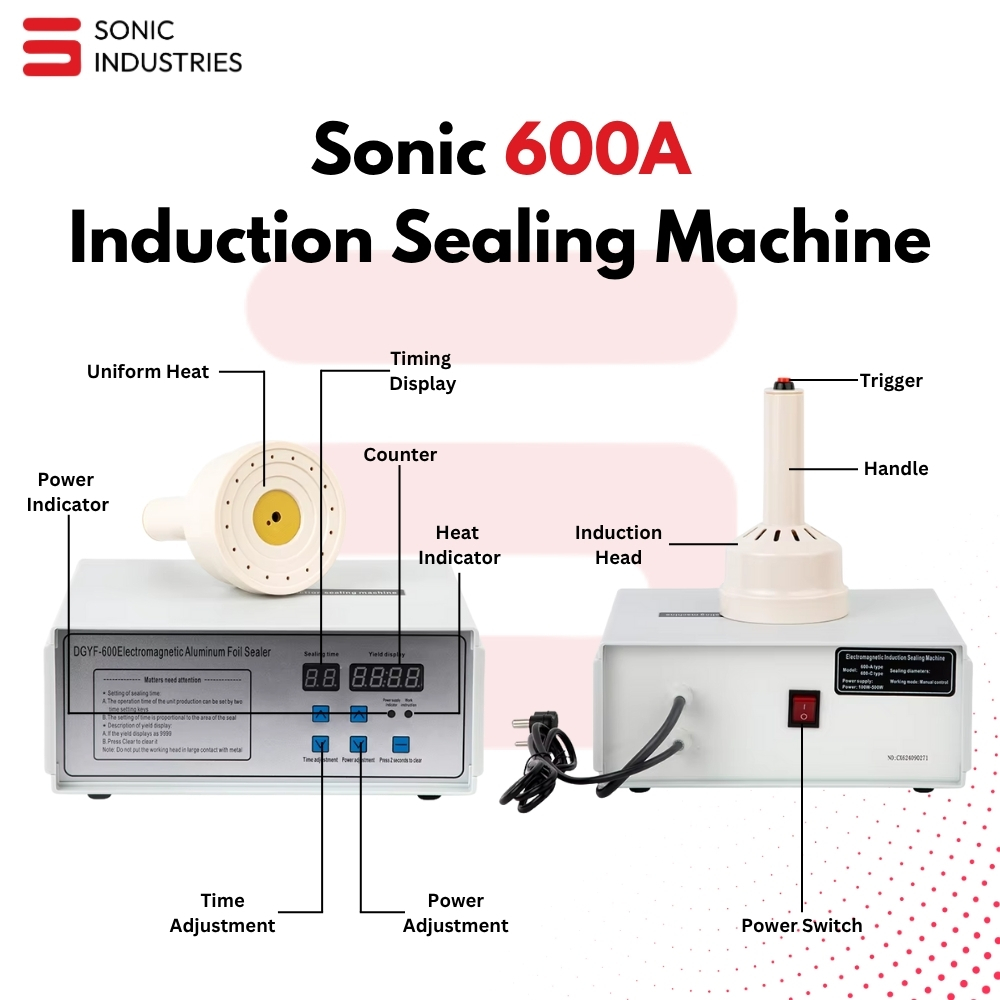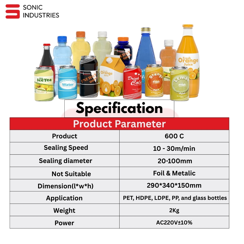 The Sonic Industries 600A Induction Sealing Machine eliminates these risks by providing airtight, tamper-evident, and leak-proof seals for medium-sized caps (20–100mm). Built for high-volume production lines, the 600A combines cutting-edge electromagnetic induction technology with a rugged, air-cooled design to ensure consistent performance shift after shift.